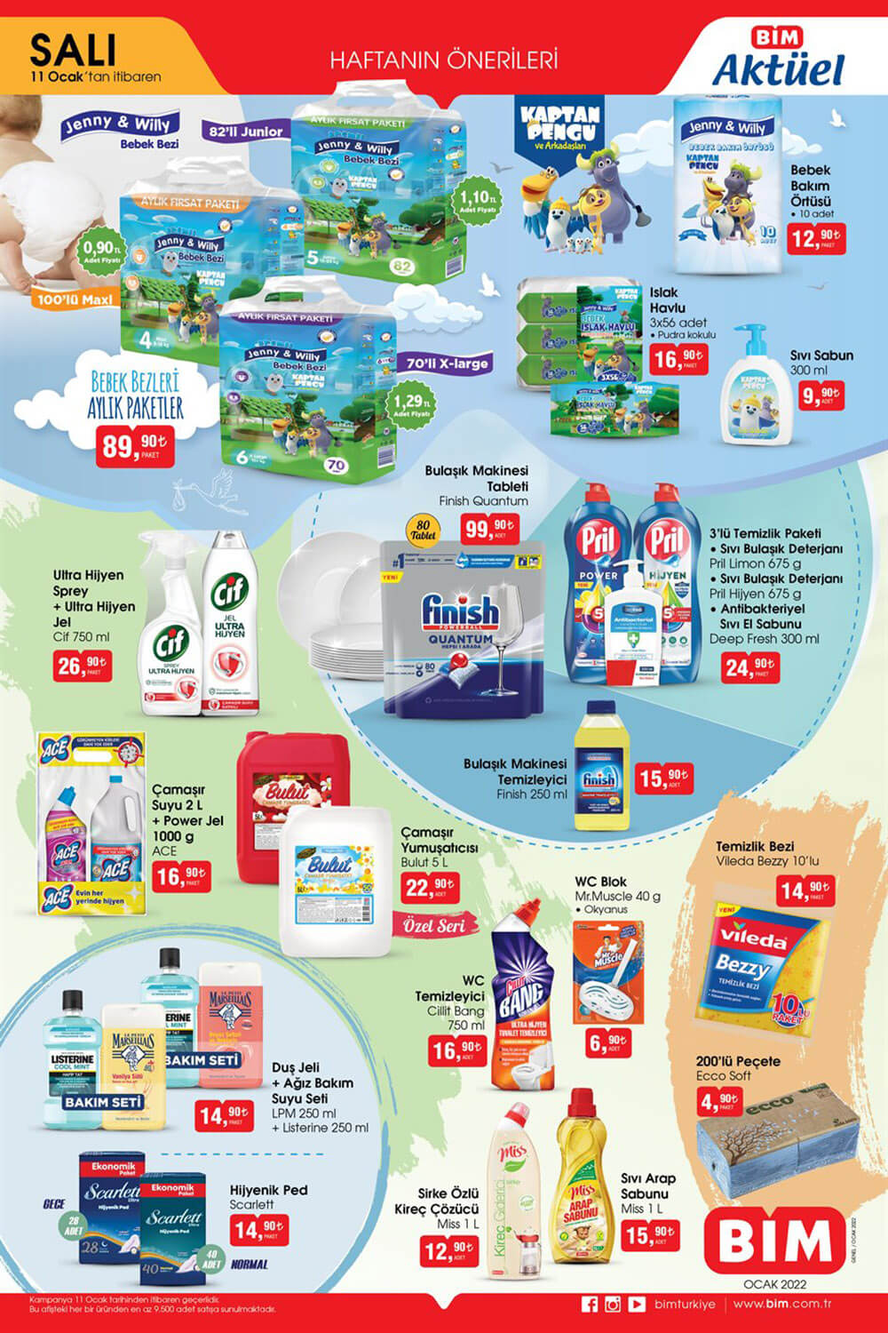Türkiye’nin en mühim mağazalarından olan BİM haftalık salı kataloğunu resmen açıkladı. Bu açıklamayla Bim 11 Ocak 2022 katalogları kesinleşti. İçerisinde iki sayfa bulunan katalog bebek bezinde, temizlik ürünlerinde, kişisel temizlik ve bakım ürünlerinde, enerji ürünlerinde indirim sunuyor. Merakla beklenen yeni listede ilk sayfa temizlikten geliyor. İlk üründe Finish Quantum Bulaşık Makinesi Tableti 80’li 99,90 TL fiyatla satış bekliyor. Bir öteki güncel katalog ürününde Pril Limon 675 gr + Pril Hijyen 675 gr + Deep Fresh Antibakteriyel Sıvı El Sabunu 300 ml 24,90 TL’den satılırken temizlik ürünlerinde Finish Bulaşık Makinesi Temizleyici 250 ml 15,90 TL fiyatla alıcı bekliyor. Sayfada haftanın en sevilen kampanyası olmaya aday olan bebek bezleri de var. İçerisinde Jenny & Willy Bebek Bezleri Aylık Paket 89,90 TL, Jenny & Willy Bebek Bakım Örtüsü 10’lu 12,90 TL ve Jenny & Willy Islak Havlu 3×56 Adet 16,90 TL’den satışa çıkıyor. Aktüel Ürünler olarak incelediğimiz en önemli kataloglar içinde gösterebileceğimiz 11 Ocak 2022 kataloglarında Sıvı Sabun 300 ml 9,90 TL ve Cif Ultra Hijyen Sprey + Ultra Hijyen Jel 750 ml 26,90 TL’den sizlerle. Benzer şekilde ACE Çamaşır Suyu + Power Jel 2 Litre + 1000 gr 16,90 TL’den satışta. Çok çok hususi kampanyalar sunan Bim Aktüel için Bulut Çamaşır Yumuşatıcısı 5 Litre 22,90 TL, Cillit Bang WC Temizleyici 750 ml 16,90 TL ve Mr.Muscle WC Blok 40 gr 6,90 TL. Devam eden Aktüel listelerde Miss Sirke Özlü Kireç Çözücü 1 Litre 12,90 TL, Miss Sıvı Arap Sabunu 1 Litre 15,90 TL. 11 Ocak 2022 kataloglarında Vileda Bezzy Temizlik Bezi 10’lu 14,90 TL ve Ecco Soft Peçete 200’lü 4,90 TL’den satılırken Duş Jeli + Ağız Bakım Suyu Seti 14,90 TL fiyatla satışta. Son üründe ise Scarlett Hijyenik Ped 14,90 TL’den sizlerle. Bim Salı kataloğunun ilk sayfasını özetlemek gerekirse anlattık. Siz de daha fazlasını resmi adres olan bim. com. tr ‘den öğrenebilirsiniz.