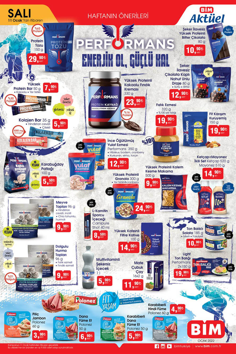 Bim 11 Ocak 2022 Aktüel Ürünler kataloğunun sunmuş olduğu fırsatlar şaşırtmaya devam ediyor. Bim Salı Aktüel Ürünlerinde bulunacak olan ve “Enerjik Ol, Güçlü Kal” sloganına sahip Performans maralı ürünler sizlerle olacak. İçerisinde ne var bakalım: İlk olarak Performans Protein Tozu 150 gr 29,90 TL. Performans Şeker İlavesiz Yüksek Proteinli Bitter Çikolata 80 gr 10,90 TL ve Performans Şeker İlavesiz Çikolata Kaplı Nohut Unlu Draje 80 gr 12,90 TL. Sayfada nerede ise tüm ürünler Performans markalı… İlgili markanın ürünlerinde Performans Yüksek Proteinli Kakaolu Fındık Kreması 330 gr 23,90 TL, Performans Fit Karışım Kuruyemiş 150 gr 19,90 TL. Bir öteki kampanyada Performans Fıstık Ezmesi 320 gr 19,90 TL. Performans Yüksek Protein Bar 50 gr 7,90 TL, Performans Kolajen Bar 35 gr 5,90 TL, Performans Karabuğday Patlağı 100 gr 5,50 TL, Performans İnce Öğütülmüş Yulaf Ezmesi 12,90 TL, Performans Yüksek Proteinli Granola 300 gr 24,90 TL, Performans Yüksek Proteinli Kalem Kesme Makarna 500 gr 9,90 TL, Performans Ketçap + Mayonez İkili Set 14,90 TL ve Performans Meyve Topları 9,90 TL. Bir öteki Bim 11 Ocak 2022 kataloglarında Performans Yüksek Kafeinli Filtre Kahve 100 gr 14,90 TL, Performans Multivitaminli Şekersiz İçecek 1 Litre 5,90 TL ve Performans Mate Çubuk Çay 16×2 gr 11,90 TL. Aktüel Ürünler Bim 11 Ocak 2022 fırsatları içinde Performans markalı ürünler sizlerle olmayı sürdürüyor. Performans Ton Balıklı Salata 10,90 TL, Performans Light Ton Balığı 2×150 gr 19,90 TLSon olarak ise Performans Dolgulu Hurma Topları 9,90 TL. Son bölümde ise Carnipure Shot L-Karnitin Sporcu İçeceği 40 ml 8,50 TL. Polonez markalı olarak ise Polonez Piliç Jambon 60 gr 3,90 TL, Polonez Dana Füme Et 50 gr 6,90 TL, Polonez Karabiberli Dana Füme Et 50 gr 5,90 TL ve son olarak Polonez Karabiberli Hindi Füme 60 gr 4,90 TL’den sizlerle. Bim Aktüel listelerinin 11 Ocak 2022 indirimlerini inceledik. Sonraki katalogda görüşmek suretiyle indirimli günler diliyoruz. Ayrıca bu ve bunun gibi tüm güncel Bim kataloglarını resmi adres bim. com. tr ‘Den ziyaret edin!
