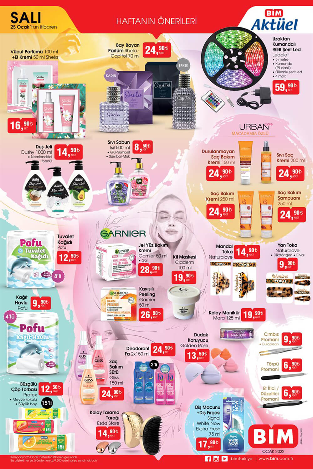 Türkiye’nin en büyük indirim mağazalarından BİM yeni bir fırsat sayfası sunarak bu haftayı şenliğe çeviriyor. Bim 25 Ocak 2022 günü satacağını resmen ilan ettiği kataloglarında iki sayfada onlarca ürün sunmuş görünüyor. İçeriğinde gıda ürünleri, kozmetik ürünleri ve kişisel bakım ürünleri bulunduran iki sayfalık katalog büyük ilgi göreceğe benziyor. Ürünlerin incelemesine geçecek olursak ilk olarak kozmetik v.b. ürünlerinin bulunduğu sayfadan başlayalım. 25 Ocak 2022 Bim Salı kataloğunda ilk olarak Ledolet Uzaktan Kumandalı RGB Şerit Led 59,90 TL’den geliyor. Bu ürünün ardından ise Shela Vücut Parfümü 100 ml + El Kremi 50 ml 16,90 TL gibi muhteşem bir fiyatla satış bekliyor. Ek olarak bu hafta Shela – Capitol Bay Bayan Parfüm 70 ml 24,90 TL’den satışa çıkarken bir sonraki üründe Dushy Duş Jeli 1000 ml 14,50 TL’den sizlerle oluyor. Temizlik ürünlerinde Işıl Sıvı Sabun 500 ml 8,50 TL’den sizlerle oluyor. Bim Aktüel Salı kataloglarının bir diğer fırsatında Urban Durulanmayan Saç Bakım Kremi 150 ml 24,90 TL ve Urban Sıvı Saç Kremi 200 ml 24,90 TL’den geliyor. Urban ürünlerinde Urban Saç Bakım Kremi 250 ml 24,90 TL ve Urban Saç Bakım Şampuanı 250 ml 24,90 TL’den sizlerle oluyor. Garnier markalı iki üründe ise Garnier Jel Yüz Bakım Kremi 50 ml 28,90 TL ve Garnier Kayısılı Peeling 50 ml 26,90 TL2den sizlerle BİM Aktüel kataloglarında buluşuyor. Bir başka fırsat ürününde Claderm Kil Maskesi 100 ml 19,90 TL ve Naturalove Mandal Toka 14,90 TL. Ayrıca Naturalove Yan Toka 9,90 TL ve ek olarak Mara Kolay Manikür 125 ml 19,90 TL’den sizlerle oluyor. Bir diğer üründe Golden Rose Dudak Koruyucu 13,50 TL ve Signal White Now Ekstra Fresh Diş Macunu 75 ml + Diş Fırçası 17,90 TL sizlerle oluyor. Aktüel Ürünler arasında dikkat çeken Fa Deodorant 2×150 ml 24,90 TL. Bim listelerinde bulunan bir diğer önemli fırsatta Gliss Saç Bakım Sütü 150 ml 24,90 TL ve Esda Store Kolay Tarama Tarağı 14,90 TL. Ayıca Protex Büzgülü Çöp Torbası 15’li 12,50 TL, Pofu Kağıt Havlu 4’lü 9,90 TL ve Pofu Tuvalet Kağıdı 8’li 12,50 TL. Tüm bu indirimli ürünlerin bir sonraki sayfasında ise gıda fırsatlar var.
