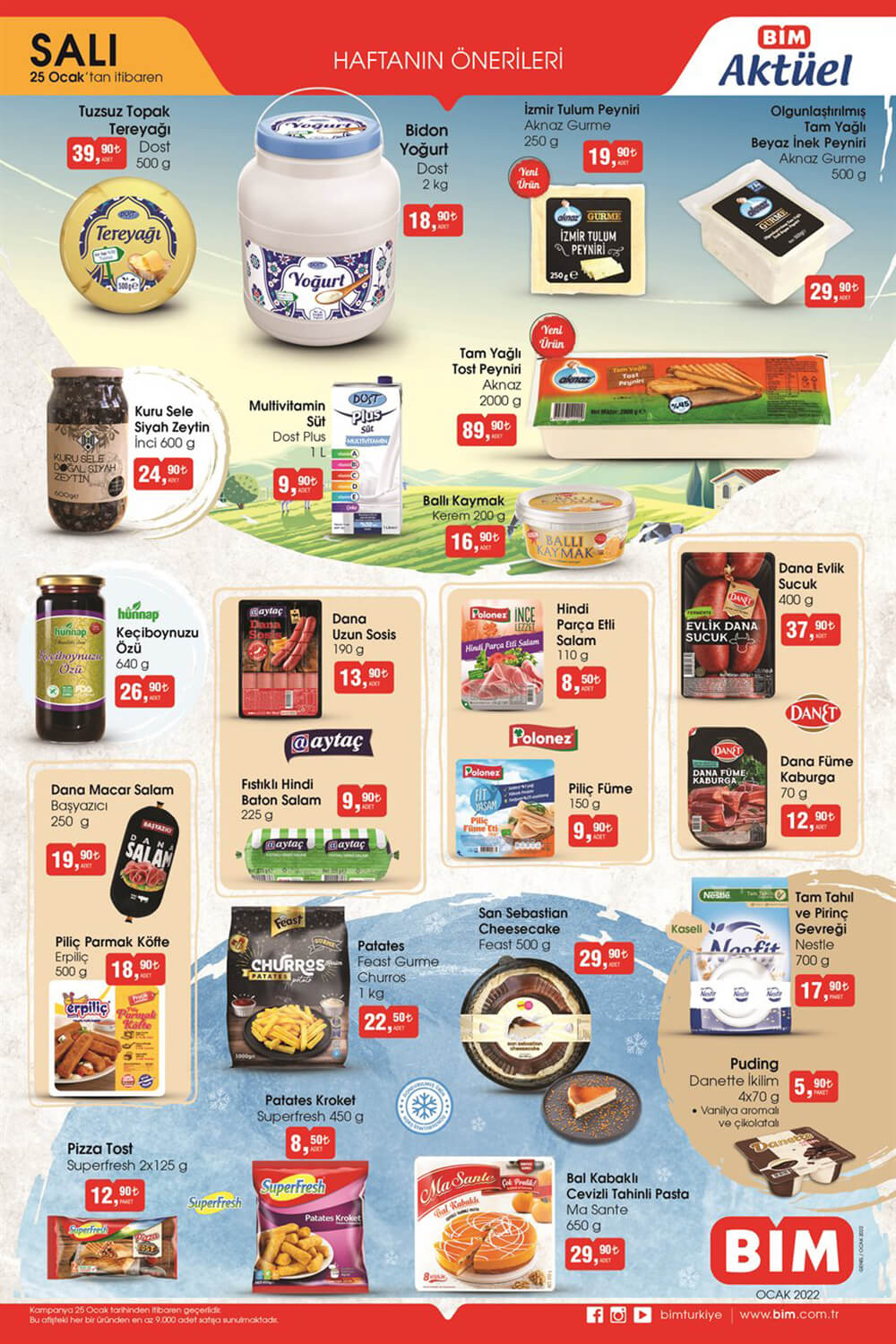 Bim 25 Ocak 2022 Aktüel Ürünler kataloğunda bulunan haftanın en önemli salı kampanyalarında Bim’i Bim yapan muhteşem fiyatlar ve kaliteli ürünler var. İndirim listelerinde yerini alan bu ürünlerde ilk olarak Bim’den bildiğimiz Dost var. Dost Tuzsuz Topak Tereyağı 500 gr 39,90 TL’den geliyor. Bir sonraki üründe Dost Bidon Yoğurt 2 Kg 18,90 TL’den satışta. Ayrıca bu hafta Aknaz Gurme İzmir Tulum Peyniri 250 gr 19,90 TL. Aktüel listelerde Dost Plus Multivitamin Süt 1 Litre 9,90 TL. Bim Aktüel olarak bildiğimiz fırsatlarda Aknaz Tam Yağlı Tost Peyniri 2000 gr 89,90 TL, Kerem Ballı Kaymak 200 gr 16,90 TL ve İnci Kuru Sele Siyah Zeytin 600 gr 24,90 TL. Sonraki üründe Hünnap Keçiboynuzu Özü 640 gr 26,90 TL, Başyazıcı Dana Macar Salam 250 gr 19,90 TL ve Erpiliç Piliç Parmak Köfte 500 gr 18,90 TL. Aytaç ürünlerinde ise Aytaç Dana Uzun Sosis 190 gr 13,90 TL ve Aytaç Fıstıklı Hindi Baton Salam 225 gr 9,90 TL sizlerle. Polonez de Bim ile fırsat dağıtıyor. Polonez Hindi Parça Etli Salam 110 gr 8,50 TL ve Polonez Piliç Füme 150 gr 9,90 TL sizlerle. Danet markasıyla gelen Danet Dana Evlik Sucuk 400 gr 37,90 TL ve Danet Dana Füme Kaburga 70 gr 12,90 TL’den sizlerle. Aktüel Bim listelerinde 25 Ocak 2022 günü indirime giren Feast ürünlerine de bakalım. Feast Gurme Churros Patates 1 Kg 22,50 TL, Feast San Sebastian Cheesecake 500 gr 29,90 TL. Bu hafta Superfresh Pizza Tost 2×125 gr 12,90 TL, Superfresh Patates Kroket 450 gr 8,50 TL. Dahası da var. Ma Sante Bal Kabaklı Cevizli Tahinli Pasta 650 gr 29,90 TL ve Nestle Tam Tahıl ve Pirinç Gevreği 700 gr 17,90 TL sizlerle. Son olarak ise Danette İkilim Puding 4×70 gr 5,90 TL’den raflarda… Bim Aktüel 25 Ocak 2022 fırsatlarını ele aldık. Haberimizin tüm detaylarını Bim’den aldığımız bilgilere göre yaptık, siz de tüm detayları ve görselleri Bim. com. tr resmi adresinden kontrol edin. Dahası için bim. com. tr ‘yi ziyaret edin.